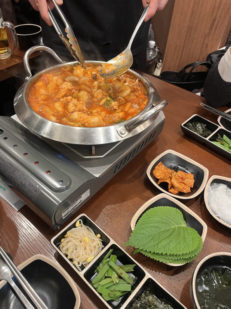 ナッコプセは たこ・えび・ホルモン が入ったピリ辛の韓国鍋で、めっちゃ旨かったです!