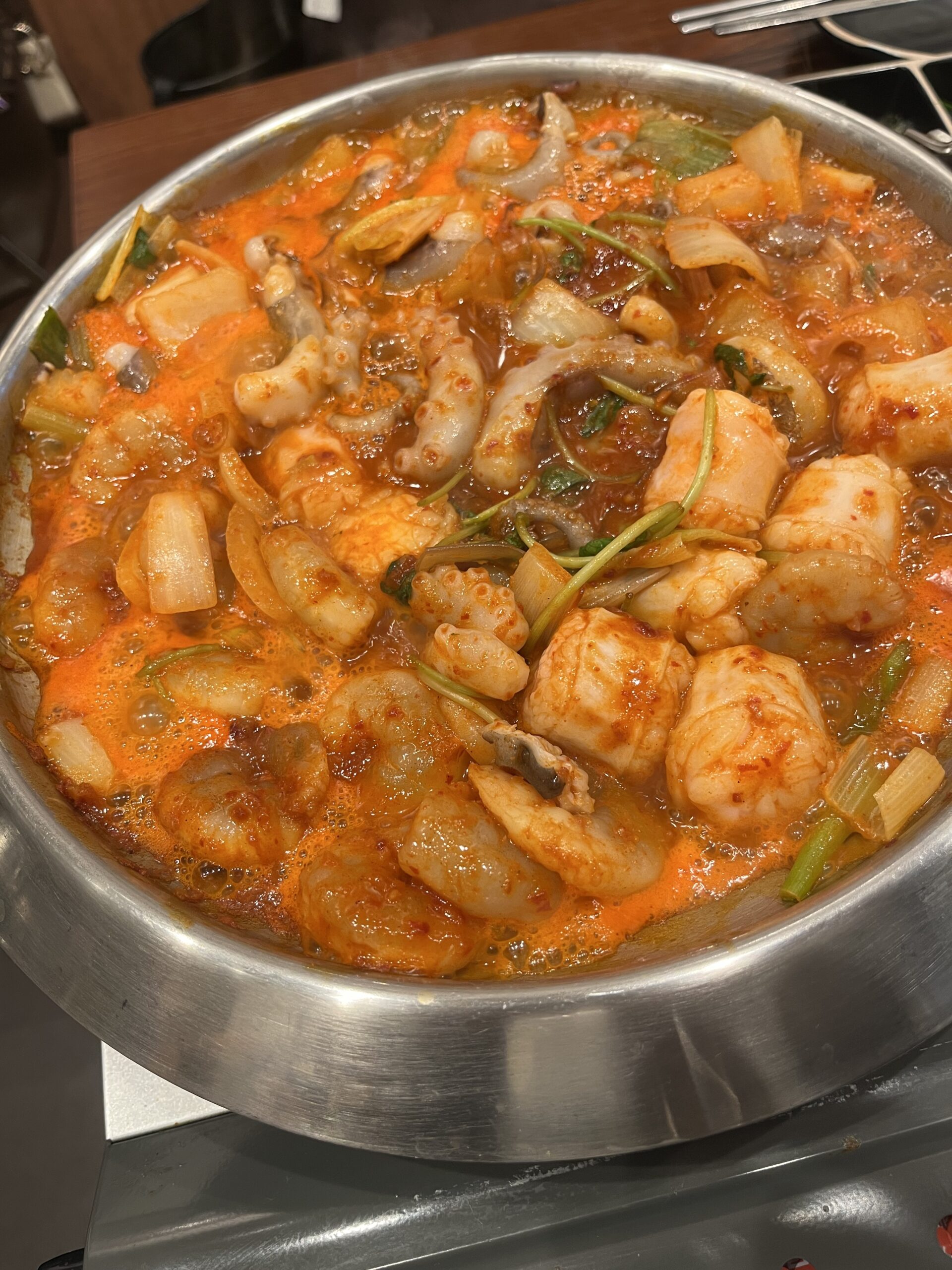 ナッコプセは たこ・えび・ホルモン が入ったピリ辛の韓国鍋で、めっちゃ旨かったです!